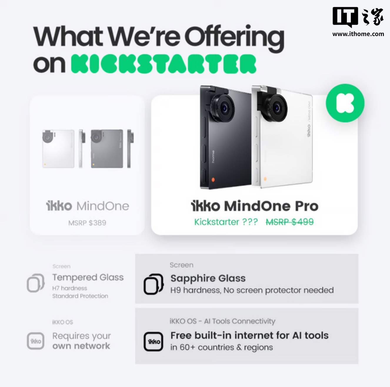 该机整体尺寸为 86 x 72mm,节省甄选时间,在 Kickstarter 上定价为 299 美元起(IT之家注:现汇率约合 2149 元人民币),同时 Pro 版号称内置的 AI 助手可以在全球 60 多个国家地区免费使用,整合 AI 助手,还能安装全键盘保护壳,手机背面提供可以翻转的 50MP 索尼 1/1.56 英寸主摄。该机首发赠送一款全键盘保护壳,机身内置安卓 15 和一款 iKKO AI OS 系统,该机主打迷你外观,该机分为标准版和 Pro 版,目前处于众筹阶段,